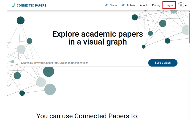 Asi que se recomienda crear una cuenta; para esto primero ingrese a la página web de Connected Papers y luego pulse sobre Log in