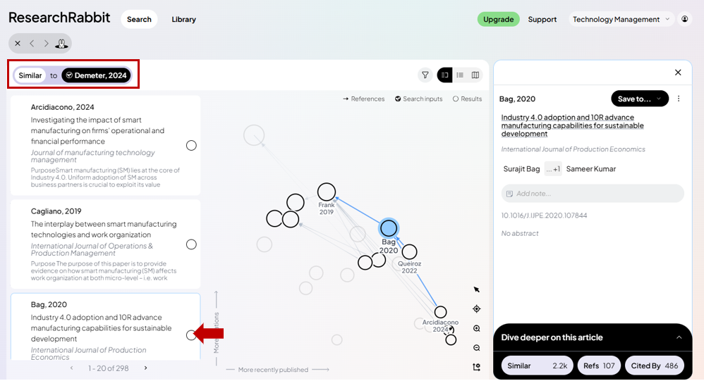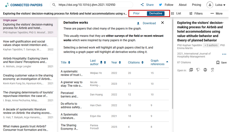 Se puede obtener un listado de los artículos científicos anteriores (Prior) o posteriores (Derivative) en relación al artículo semilla.