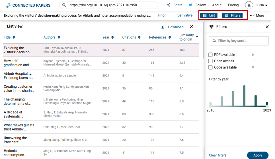 Se puede obtener un listado de los artículos científicos con datos adicionales como: cantidad de citaciones, referencias y porcentaje de relación de similitud con el artículo semilla. Además, se puede desplegar una columna para filtra por palabra clave, formato del artículo científico (PDF), recursos de acceso libre y por rango de años.