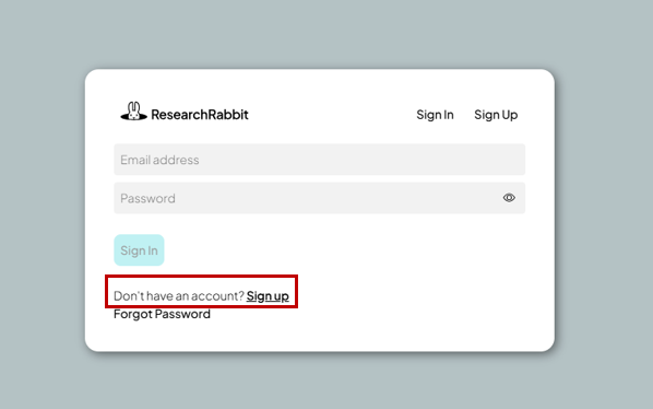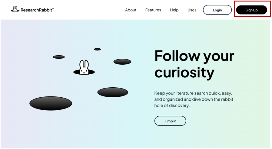 Por lo tanto es necesario crear una cuenta; para esto primero ingrese a la página web de ResearchRabbit y luego pulse sobre SingUp