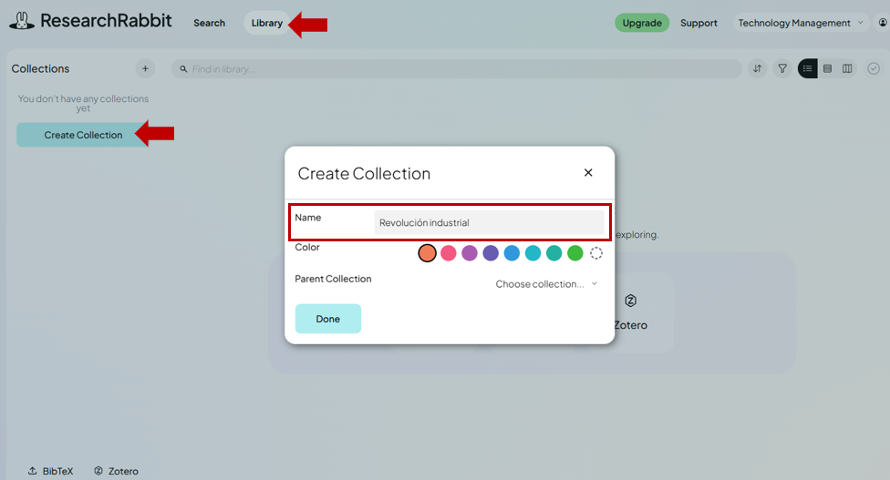 Ir a Biblioteca (Library) y pulsar sobre Create Colletion enseguida ingresar el nombre de la colección. Para este ejemplo será: Revolución Industrial.