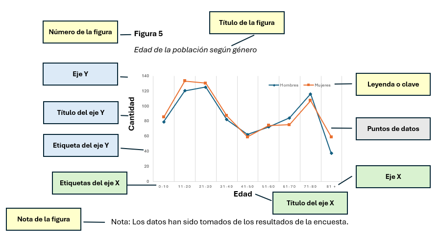 - Título de la figura: Breve, descriptivo o explicativo. Debe redactarse en mayúsculas y minúsculas, y presentarse en cursiva.
