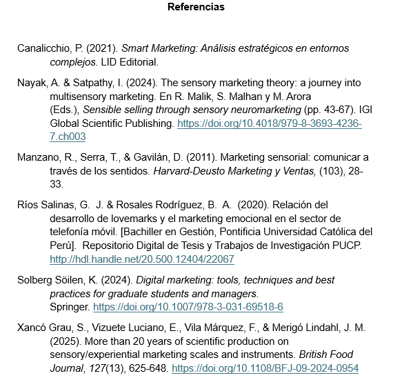 Ejemplo: de Vicuña Ancín, J. M. S. (2021). El plan de marketing digital en la práctica. Esic editorial.Artículos de revistas científicas: la fuente incluye el nombre de la revista, volumen, número, páginas y, si corresponde, el DOI o URL.