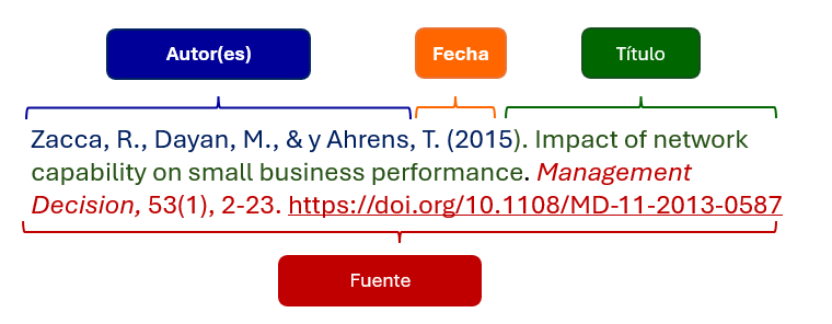Ejemplo: Díaz Landero, V. D. C., Surdez Pérez, E. G., & Reyes Cornelio, R. (2024). Modelo de 4Fs del marketing digital: Vínculo con el posicionamiento de Marca. Suma de Negocios, 15(32), 50-58. https://doi.org/10.14349/sumneg/2024.v15.n32.a6Capítulos de libros o partes de obras: la fuente es el título del libro completo, editor(es) y editorial.